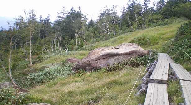 ササ、ガレ場、ササ、ガレ場と歩きにくい道を1時間ばかり登り続けると、ようやく「焼石金剛」の標識の立つ場所に着いた。標識はササ原に立っていたが、名前からするとガレ場に付けられたもののようだ。