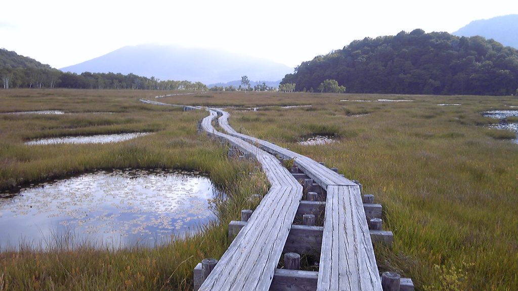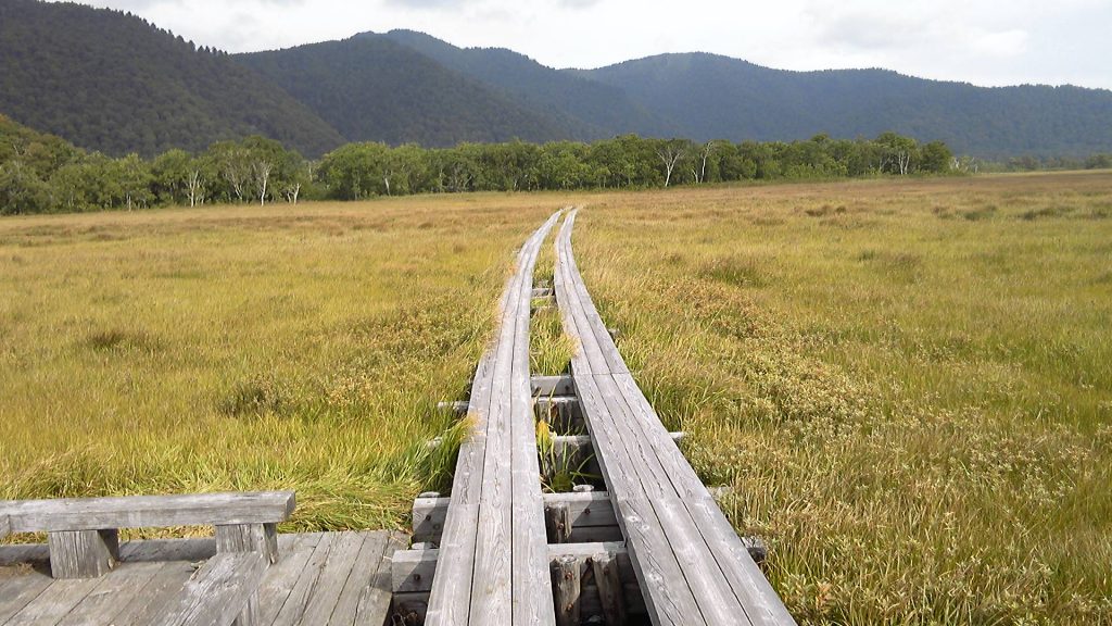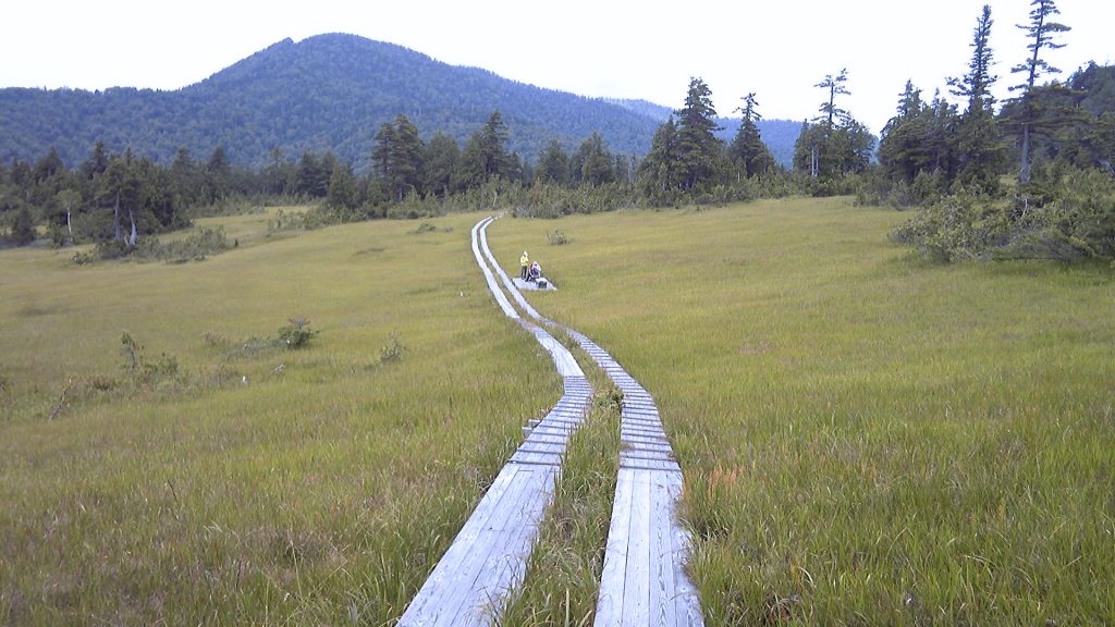 鬼怒沼高層湿原はほぼ平坦に広がっていて、進行方向は白く霞んでいる。天気がよければ燧ヶ岳が正面に見えるはずだが、行く手が白いのはきっと雲なんだろう。尾瀬沼からだって燧ヶ岳は雲の中ということがしばしばあるから、いくら近くても見えない時は見えない。
