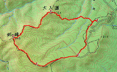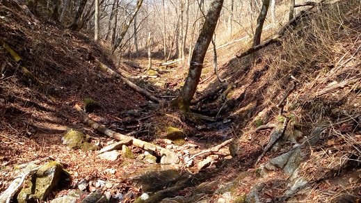 再び暗い林に入り、足元に気をつけながら下って行く。結構な段差の個所もあり、滑りやすい粘土質の赤土が湿っていて、派手に滑った靴の跡がいくつも残っていた。30分ほどで歩きやすい尾根に戻った。
