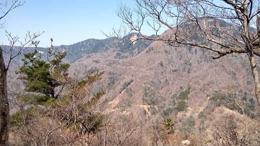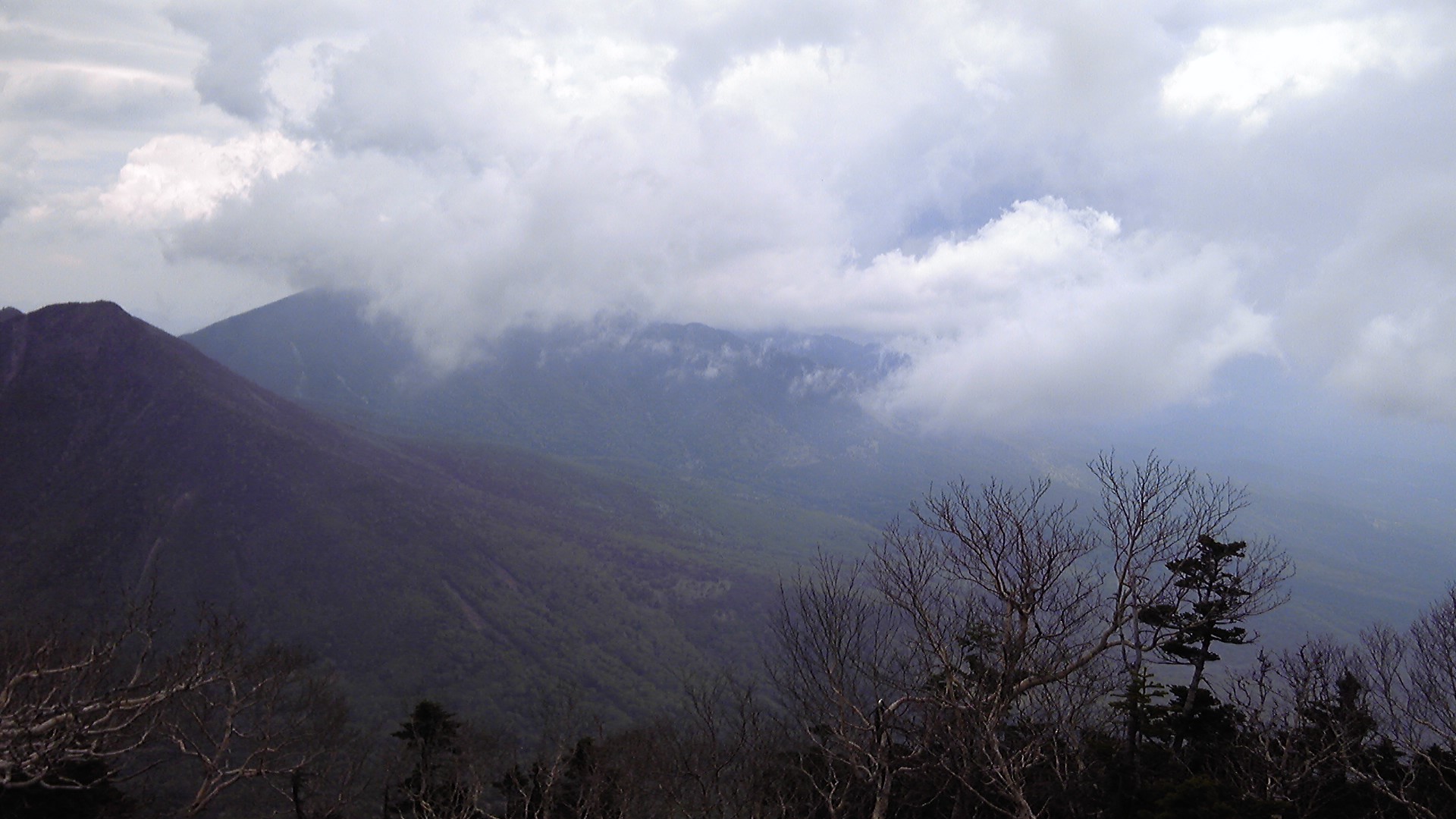 景色だけでも撮っておこうと枝の間のよさそうなアングルを探していると、これまでずっと上の方にあった雲が下りてきて、女峰山の頂上あたりを隠してしまった。2203ピークまではまだ下りてきていないものの、それより上は雲の中である。