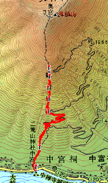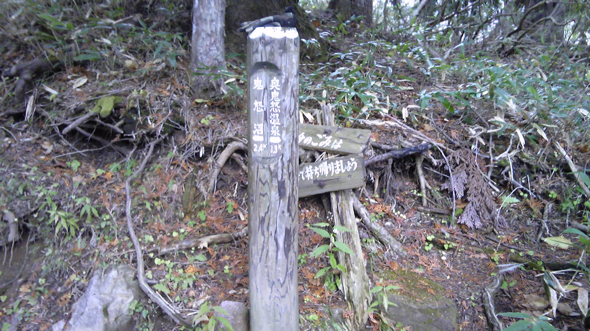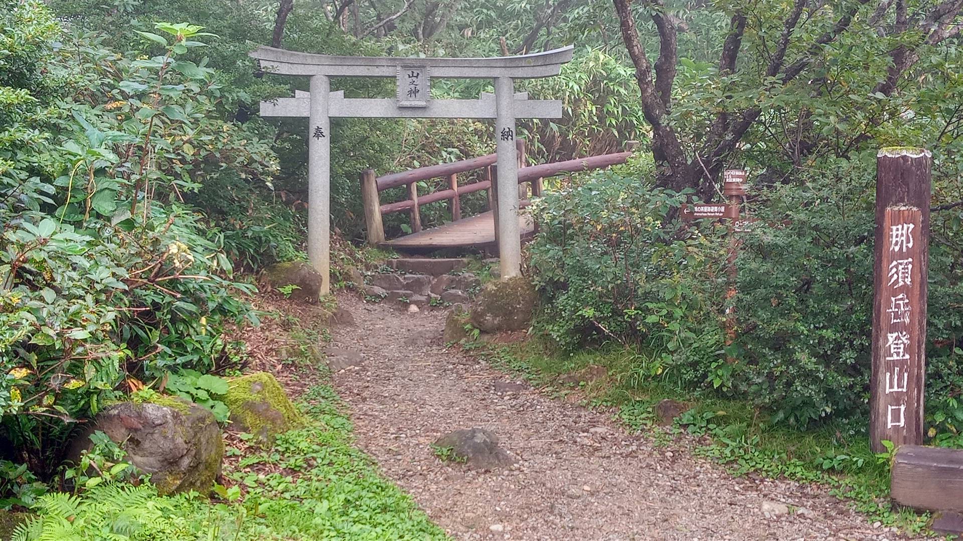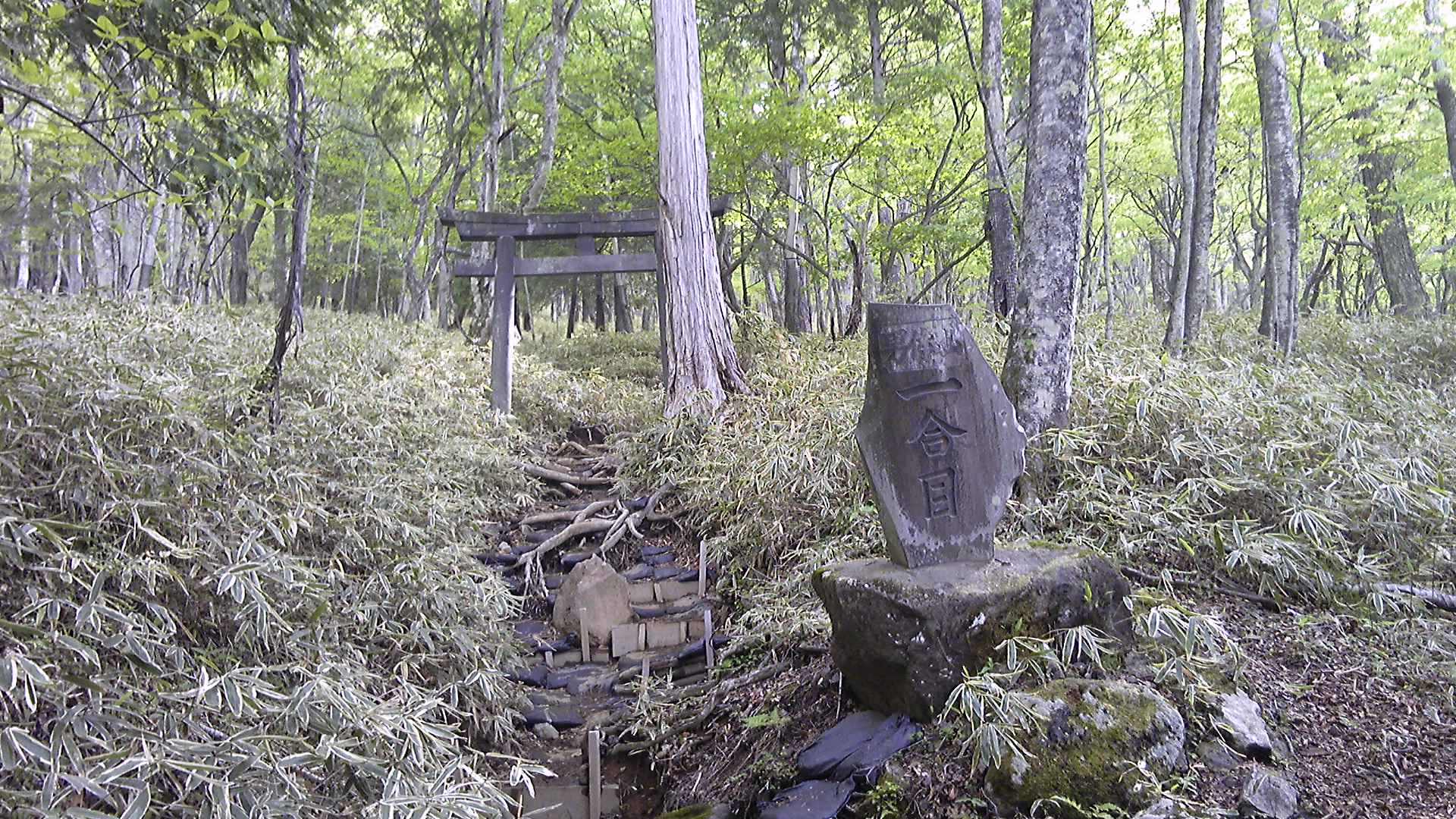 鬼怒沼方面と根名草山方面の分岐は宿から上がってすぐそこで、なんでこれを見逃したかというほど大きく書いてある。鬼怒沼方向に折れてすぐ温泉神社がある。二礼二拍手一礼で道間違いはこれくらいにしてほしいと、登山の無事をお願いする。