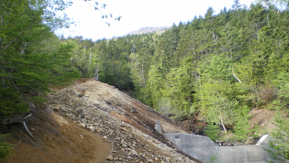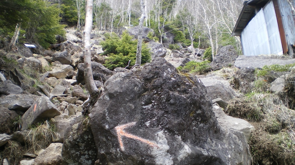 そして、川から離れてまたガレ場に出たりするのだけれど、いつまで歩いても八丁の湯が見えてこない。1時間ちょっとで八丁の湯、そこから10分で加仁湯、さらに10分で日光澤だと思いこんでいただけにつらかった。まるで、槍沢ロッヂへの道のようである。もうすぐと書いてあっても、全然すぐではない。
