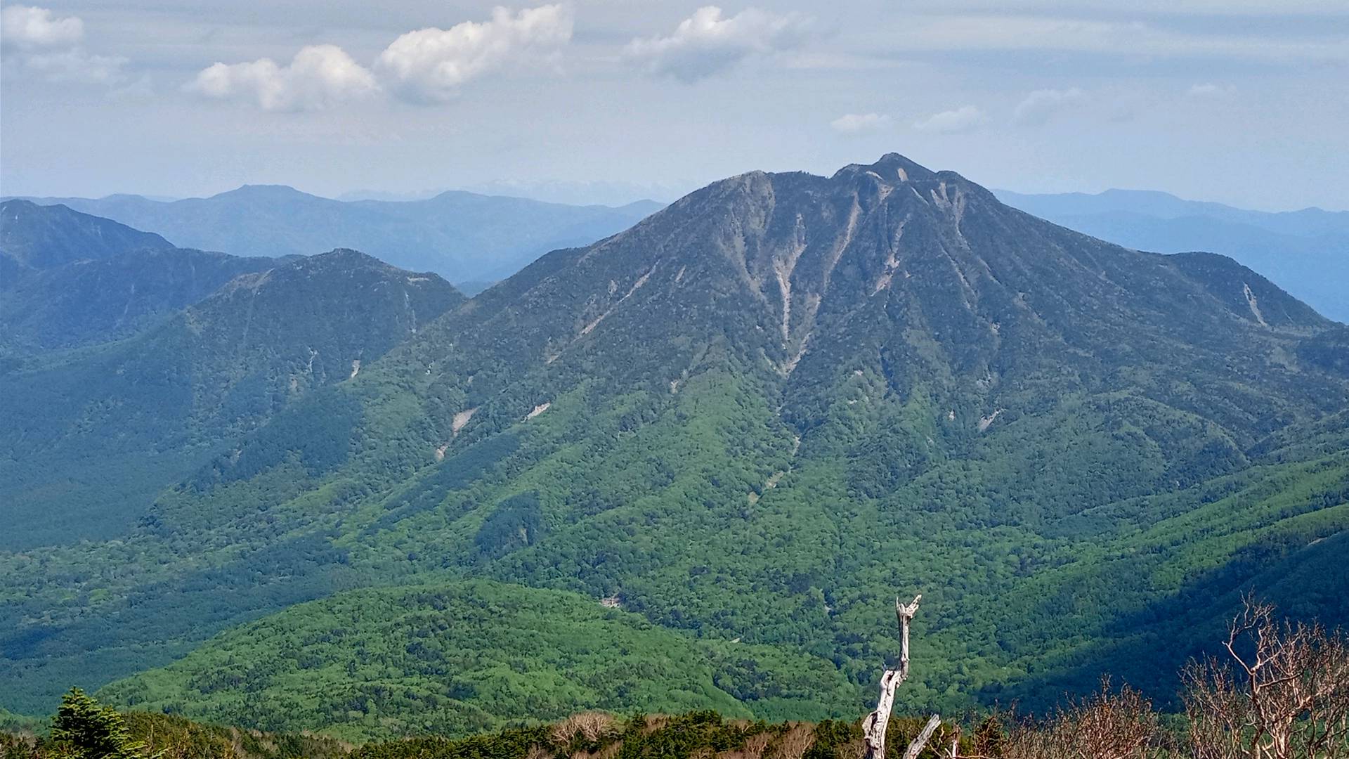手前に見えるのは日光澤温泉から登山道がつながっている根名草山、その右の釣り鐘型に見えるのが金精山と思われた。温泉ヶ岳もこの方向のはずだが、根名草山に隠れた向こう側にあるものと思われた。
