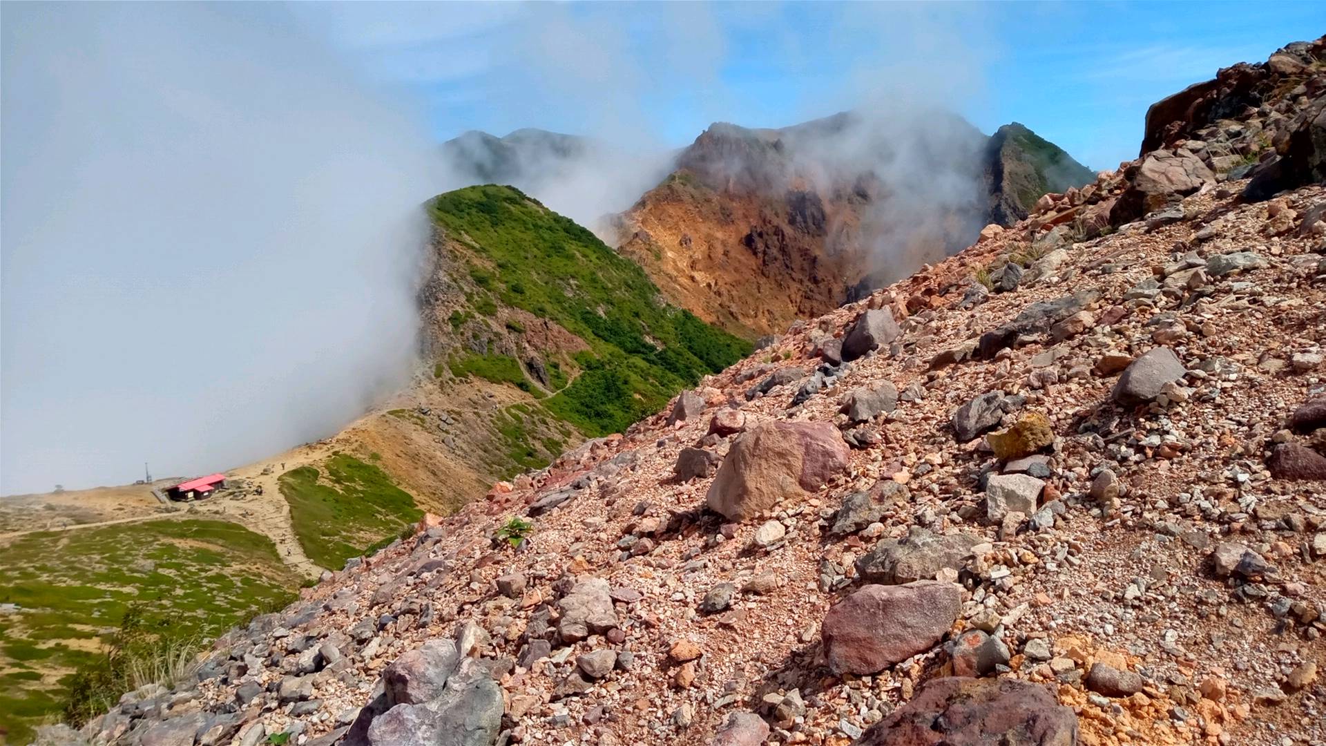 焼石金剛まで、1時間以上かけて登ったところを40分で下りる。ここからは再びササで覆われた踏み跡とガレ場の連続で、どこを下りても下には着くのだろうが、3回ほど滑って手と服を汚す羽目になった。