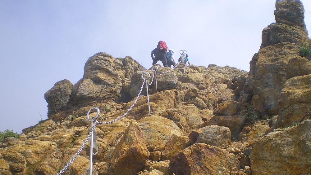 休んでから頂上までは、15分くらいだった。岩をつかんで登るような場所があり、急斜面でロープが出てくるところもあったが、この時だけはハチが飛んでこなかったのは幸いした。9時15分、小丸山から2時間、麓から3時間以上かかって、ようやく赤薙山頂上に到着した。
