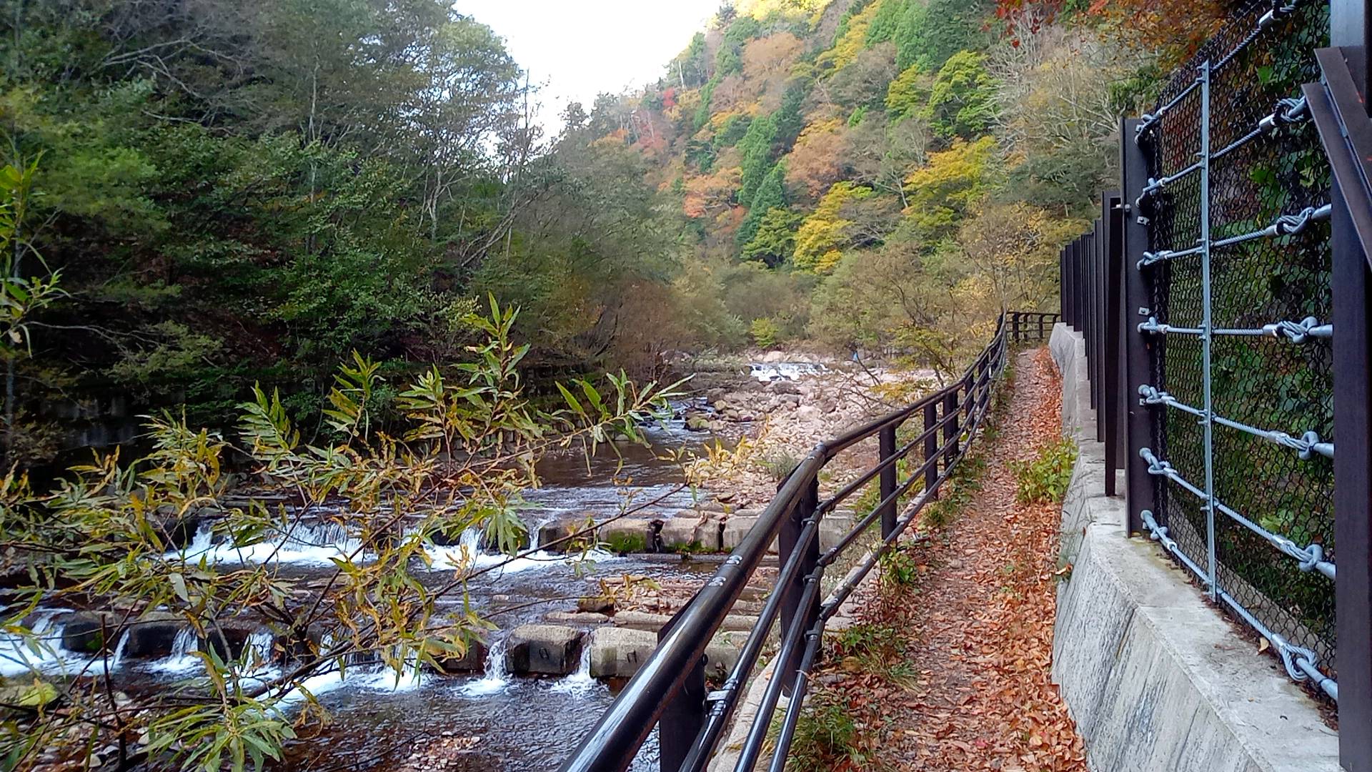 新しくきれいな筬音橋(おさおとばし)を渡って、再び鬼怒川左岸を歩く。再び、八丁の湯でスーパー林道になる前の遊歩道規格である。左手に2つ3つと砂防ダムが連続して、川音がひときわ高く響く。