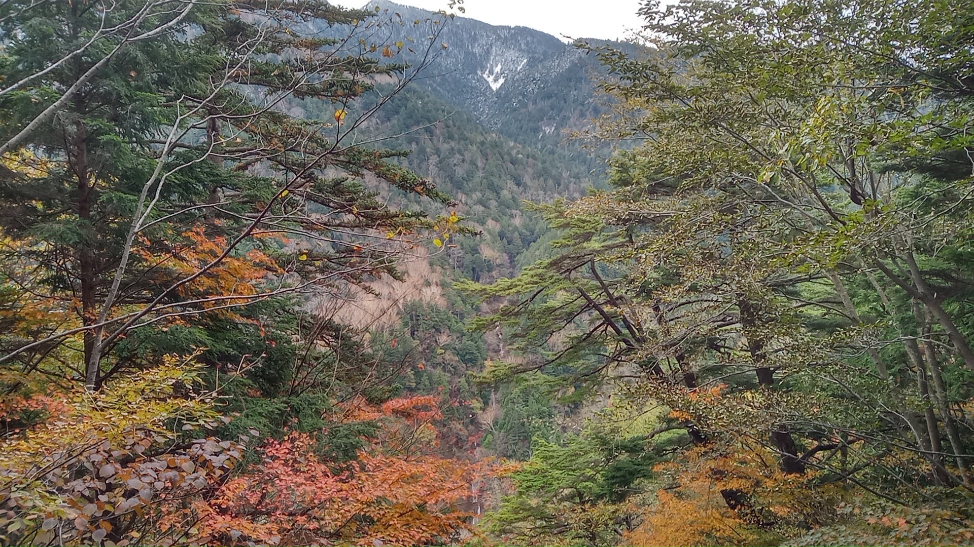 翌朝はスーパー林道経由で女夫渕まで戻る。まだ紅葉もまばらなのに、上は雪とは驚いた。時間的には、遊歩道で登ったのとあまり変わらない。