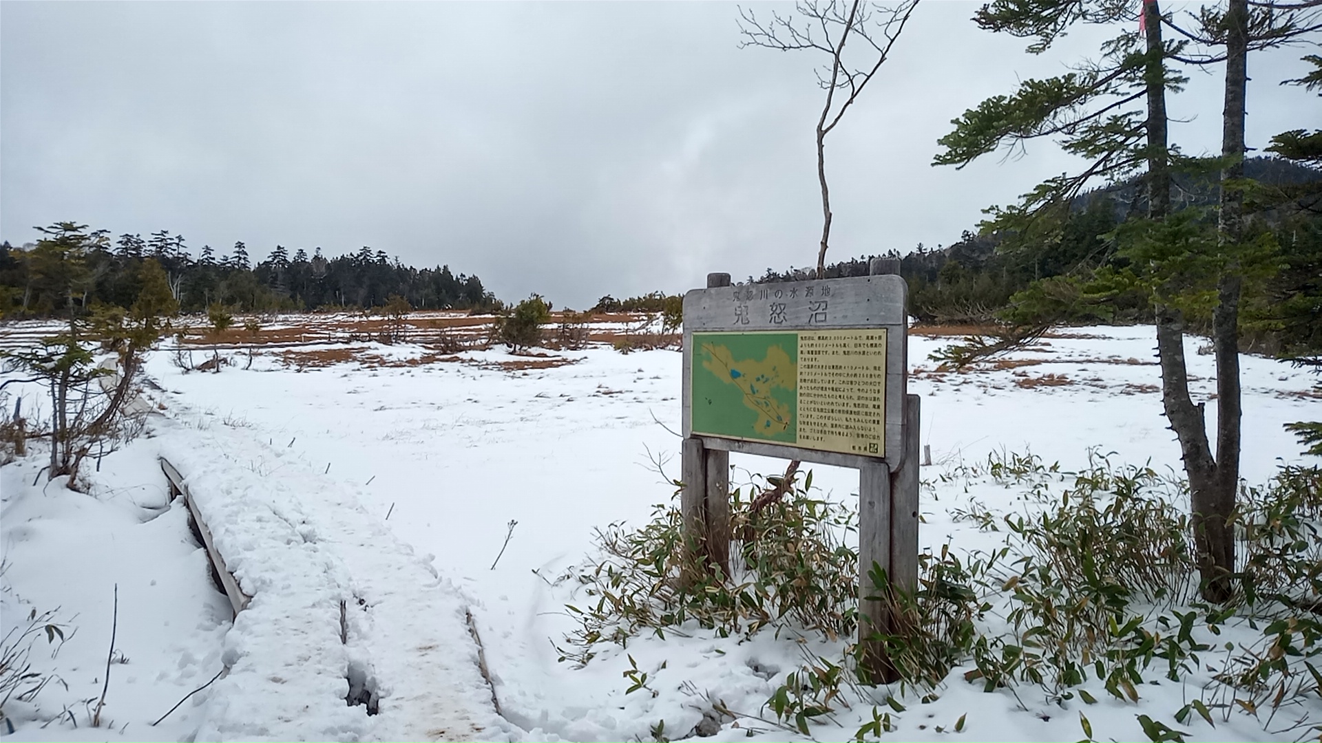 ガイドブック等で見覚えのある看板は、林から出てすぐ鬼怒沼の入り口に掲げられている。湿原の中に向かっている木道は2本あり、1本は凍っているが1本は乾いていた。その乾いている木道脇に、ベンチが置かれていて休むことができる。