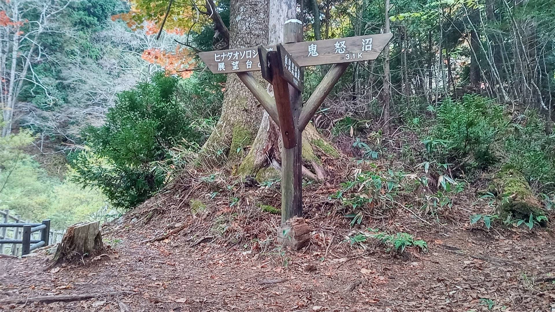 と、木々の間から人工物が目に入った。あれは、ガイドブックによく出てくる鬼怒沼の案内看板ではないだろうか。近づいて行くと、まさにそうだった。林を抜けて、鬼怒沼高層湿原に入った。12時25分到着。