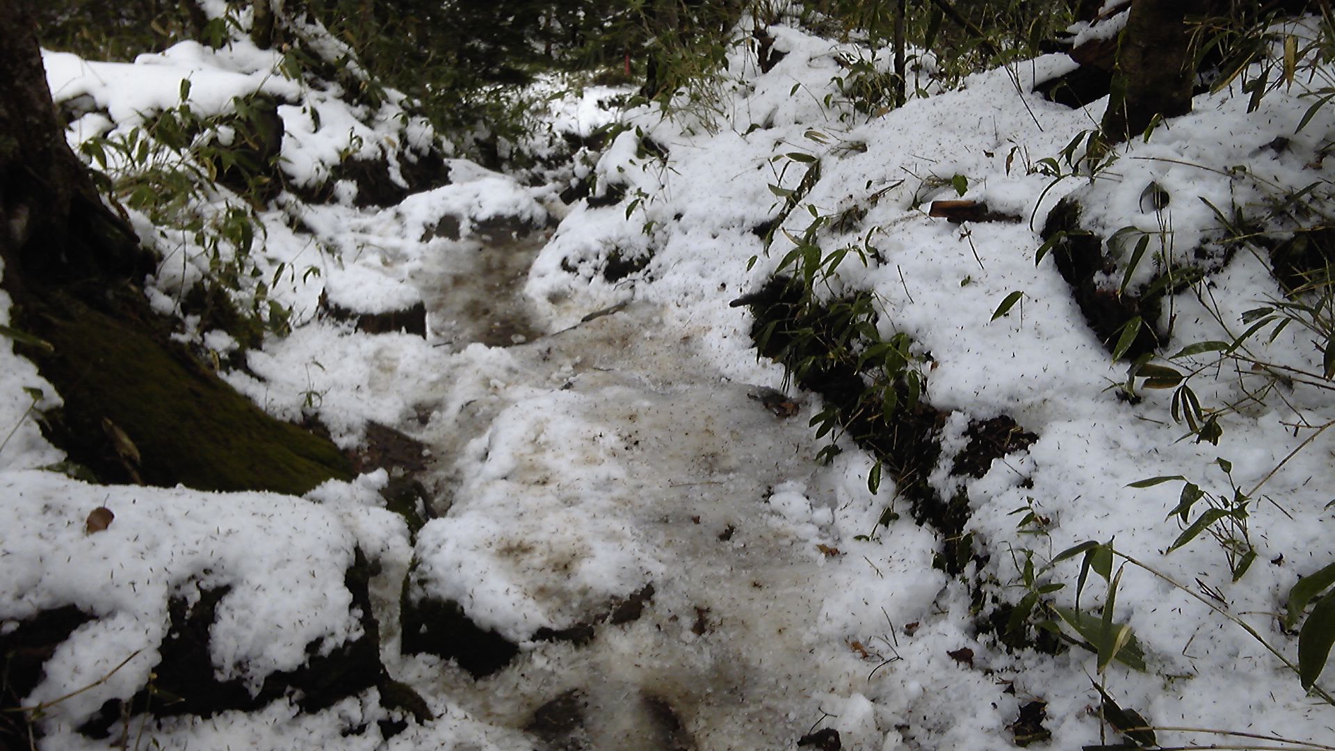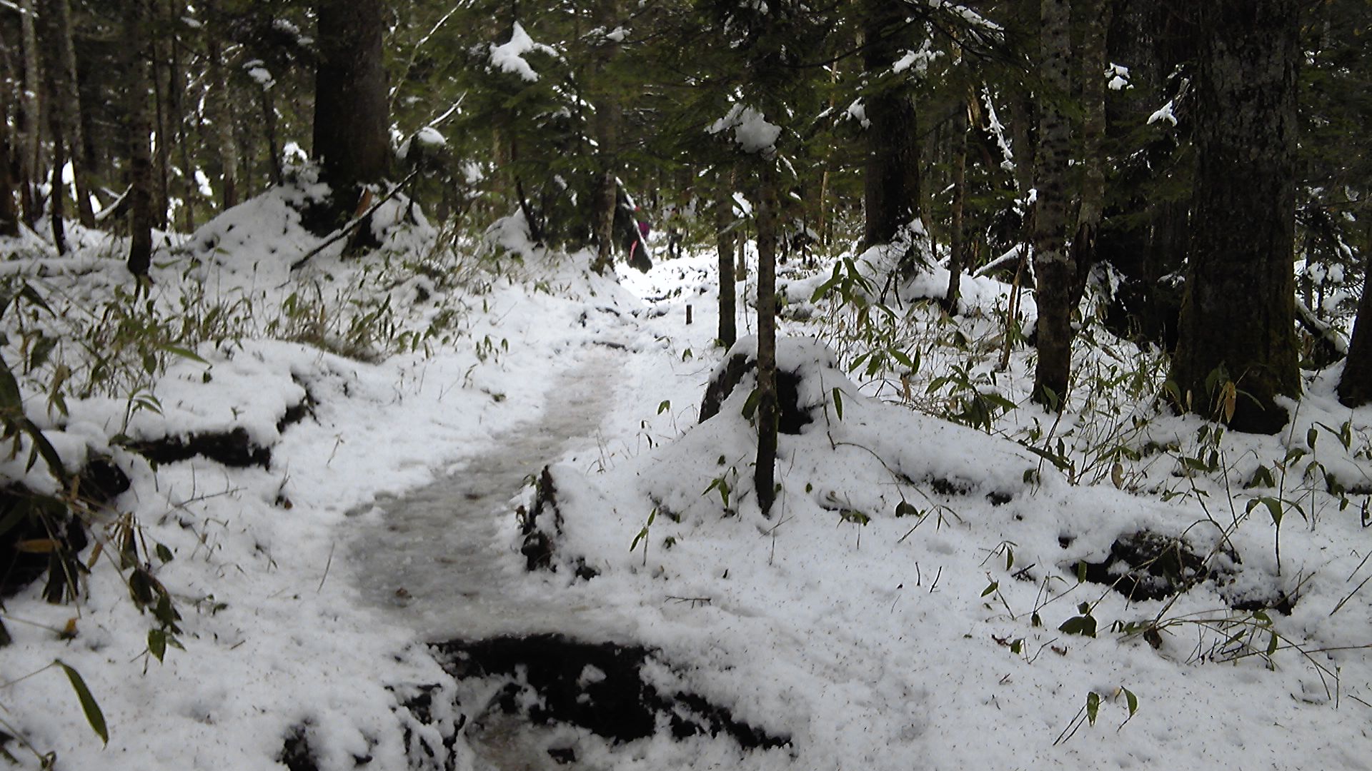 登山道の傾斜はここまでがきつくて、ここから先は比較的緩くなる。しかしながら、ここから先は雪が出てくるのだった。