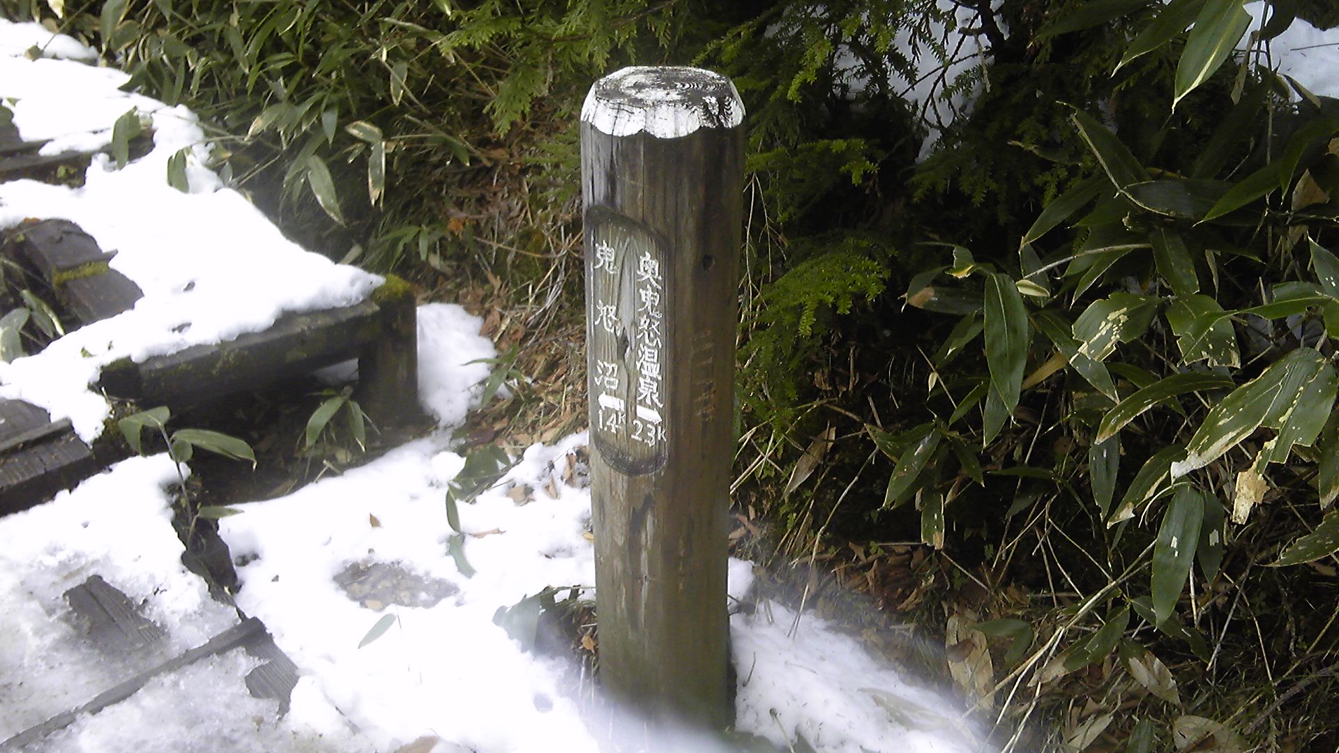 アイスバーンのひどいところは通過したはずなので、いったん荷物を下ろして服装を整える。一生懸命下っている間にスラックスがずり落ちてきて、たいそう歩きにくい。午後から雨の予報だが、雪が融ける音なのか雨音なのかはっきりしない。すでに、日光白根山が見えなくなっている。