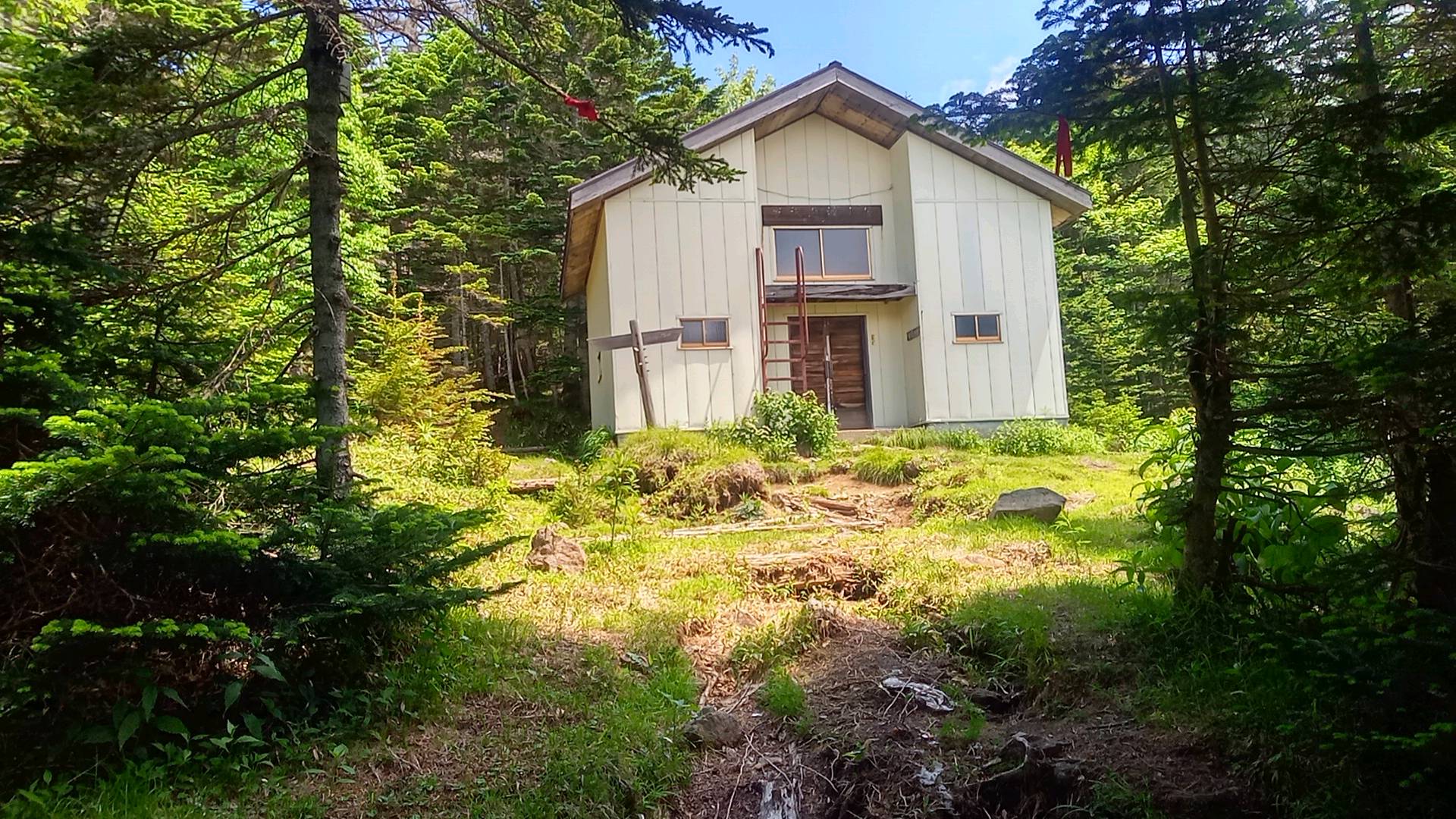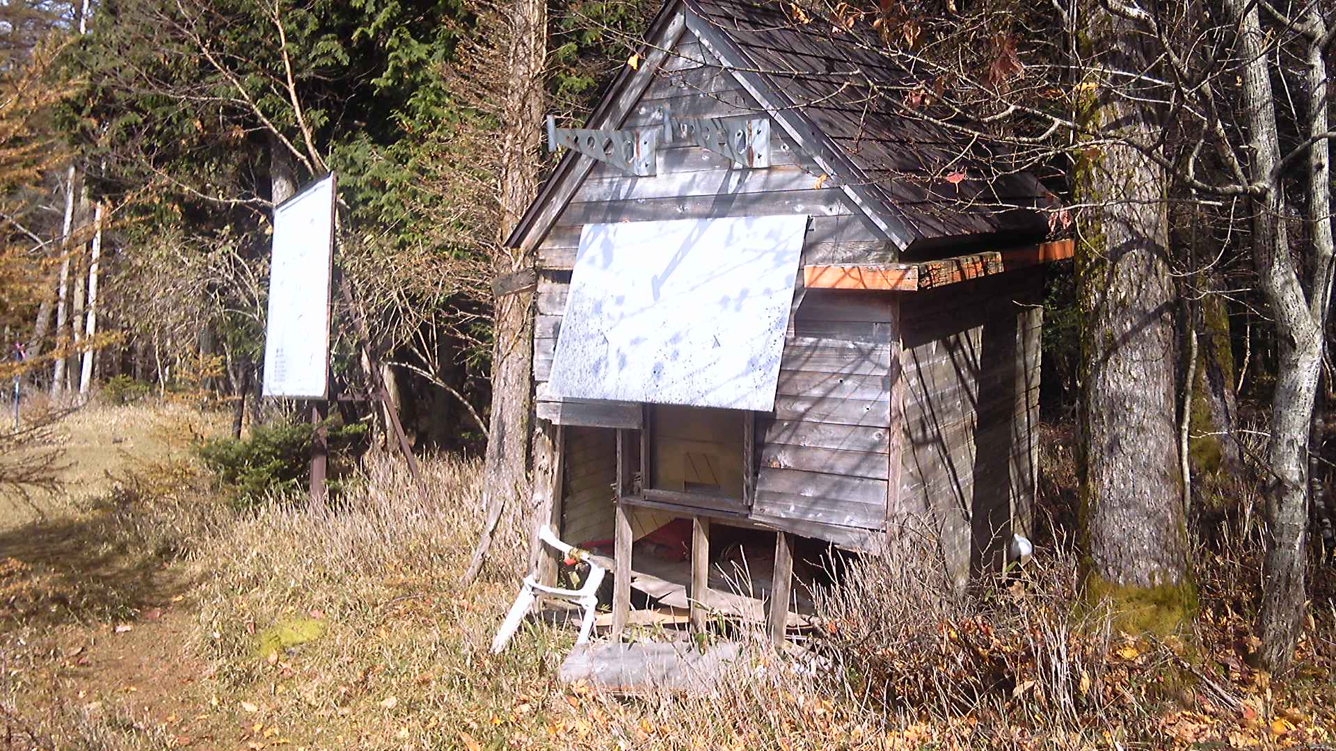 最上部にはリフト機の残骸のような小屋が残されている。どうやら、ここから南西にかつてのメイプルヒルスキー場のコースがあったらしい。「このリフトの最終時間は△△時です」と書いてあるけれども、リフトもスキー場もいまはない。