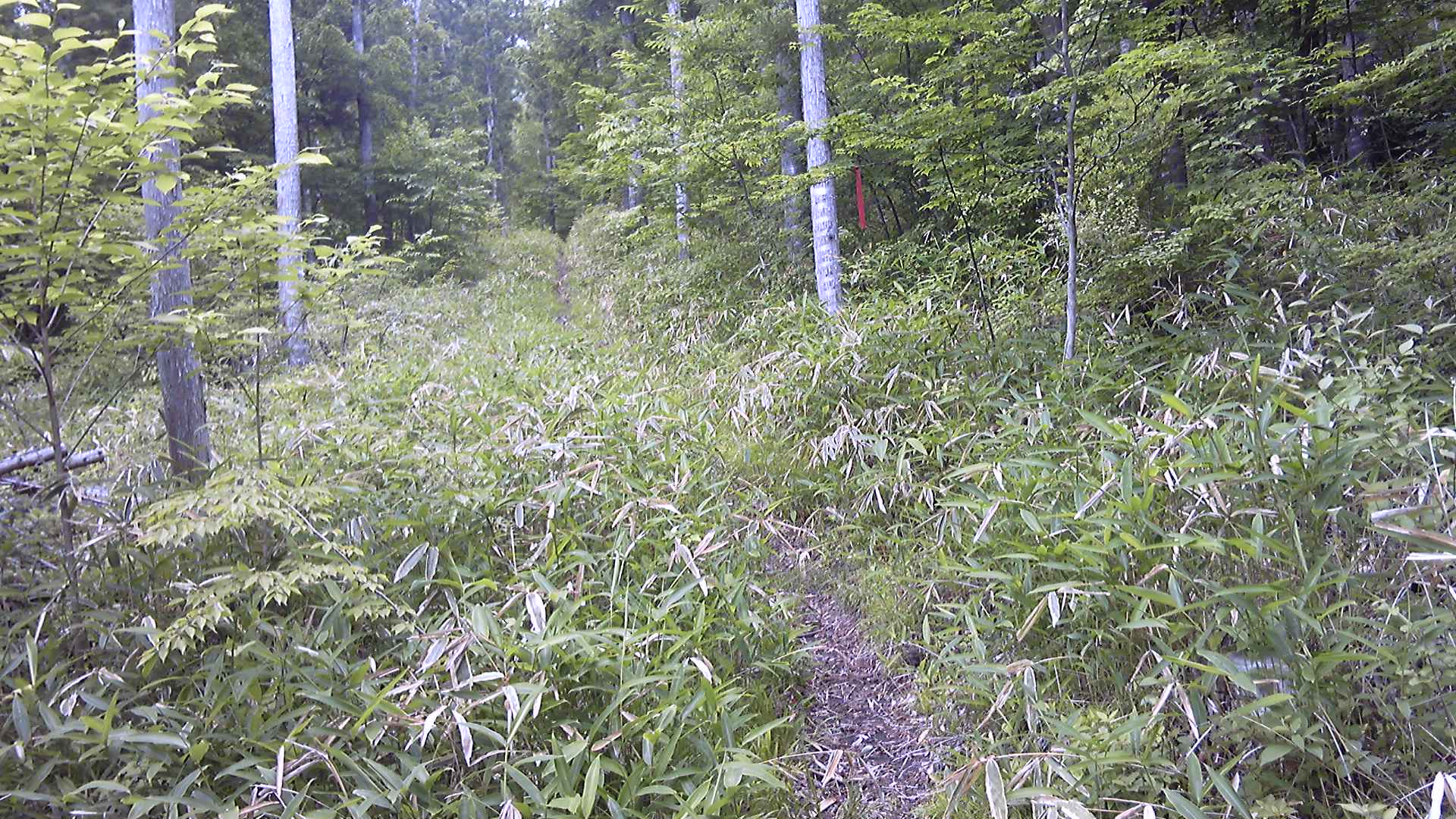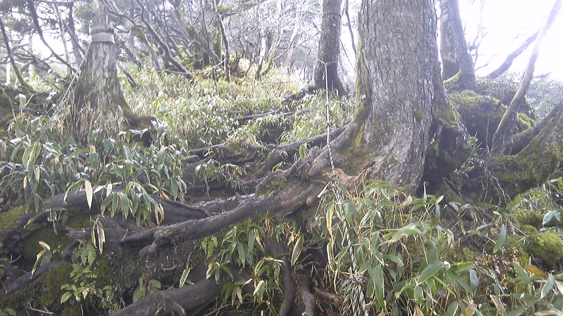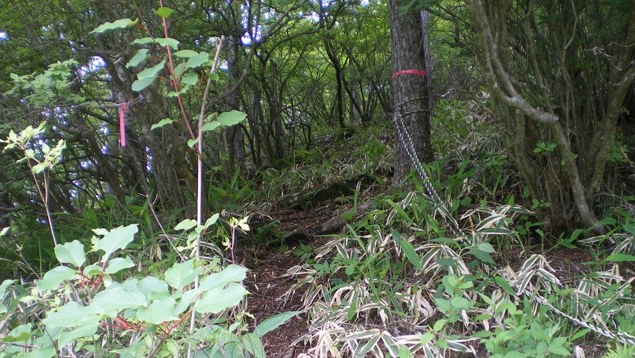 笹原の中に進んだり迷った後、なんとか赤テープを見つけた。薮をかき分けると、トラロープと幹に巻かれたはっきりした目印が見つかった。