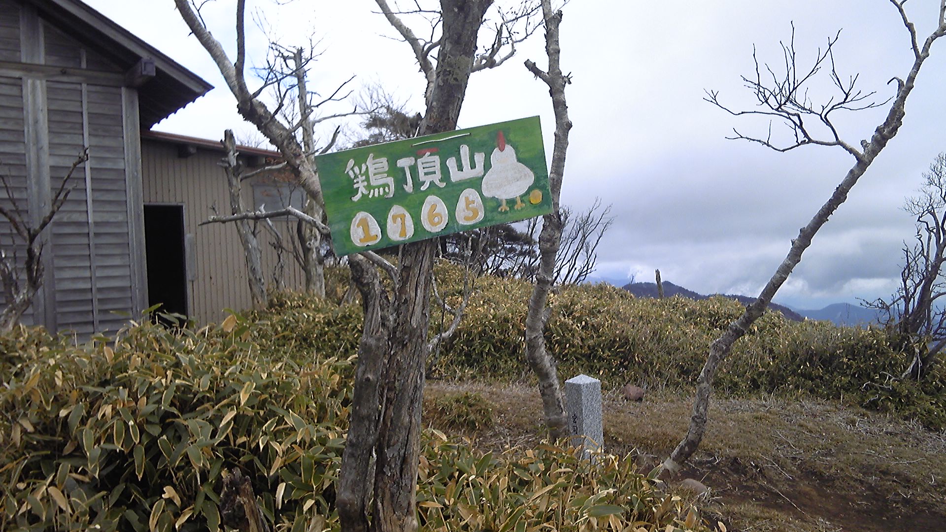 唯一、普通の山らしいのは神社の横の木に掲げられている山名標で、「鶏頂山1765」と鶏の絵が描いてある。山名標の周囲は広くなっていて、目の前に釈迦ヶ岳、中岳、西平岳が並んで見える。その眺めはすばらしい。