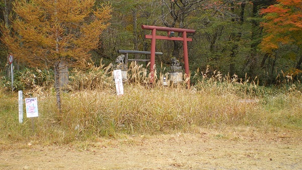 鶏頂山の登山口は、もみじラインの中ほど、エーデルワイススキー場の前にある。駐車場は鳥居からもみじラインを挟んで逆側に、二十台ほど止まれる場所がある。