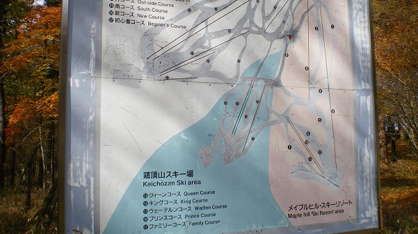 登って行く途中に、何ヶ所か案内板が残されている。いま登って行くのが鶏頂山スキー場、ゲレンデの頂点で、メイプルヒルスキーリゾート・鶏頂高原見晴スキー場と合流している。