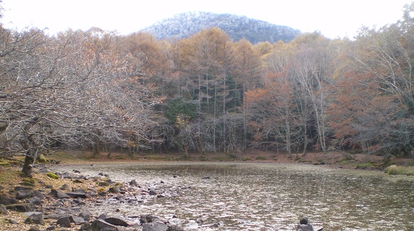 5分も歩かないうちに、大沼に着いた。ずいぶん水が少なくて、水際近くまで岩が出ている。向こう岸の林の上にこんもりした山が見える。方角から見て鶏頂山である。頂上あたりが、ぼんやり白くなっている。もしかすると、今朝の雨がここでは雪だったのだろうか。
