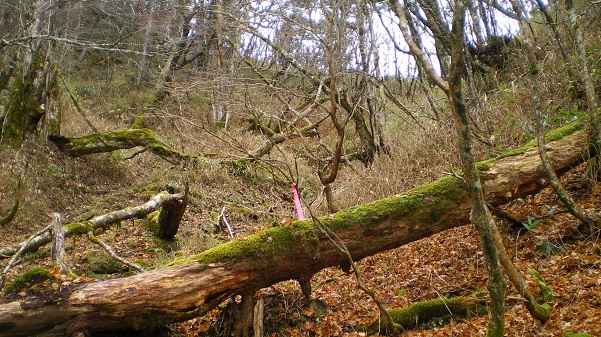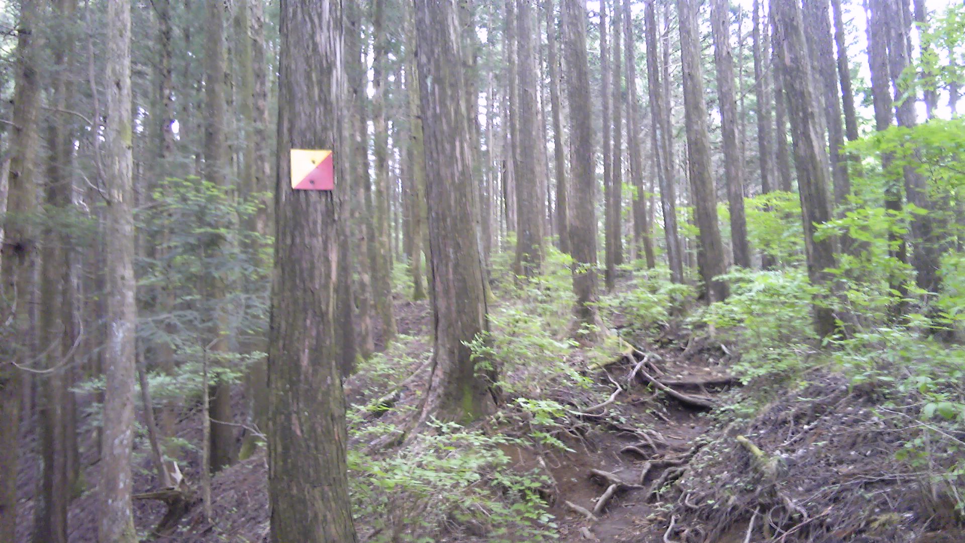 だから、時々確認できる赤テープとロープ、木の幹に打ち付けられている黄色と赤の看板が頼りである。ただ、この看板が登山道を示しているかどうかは不明である。昔オリエンテーリングの目印がこれだったし、林業で使うものかもしれない(日光標識というらしい)。