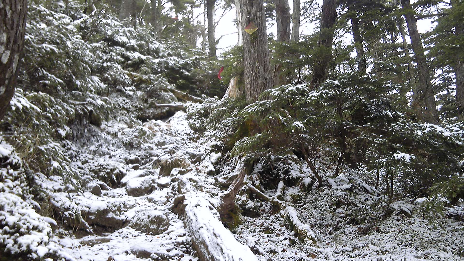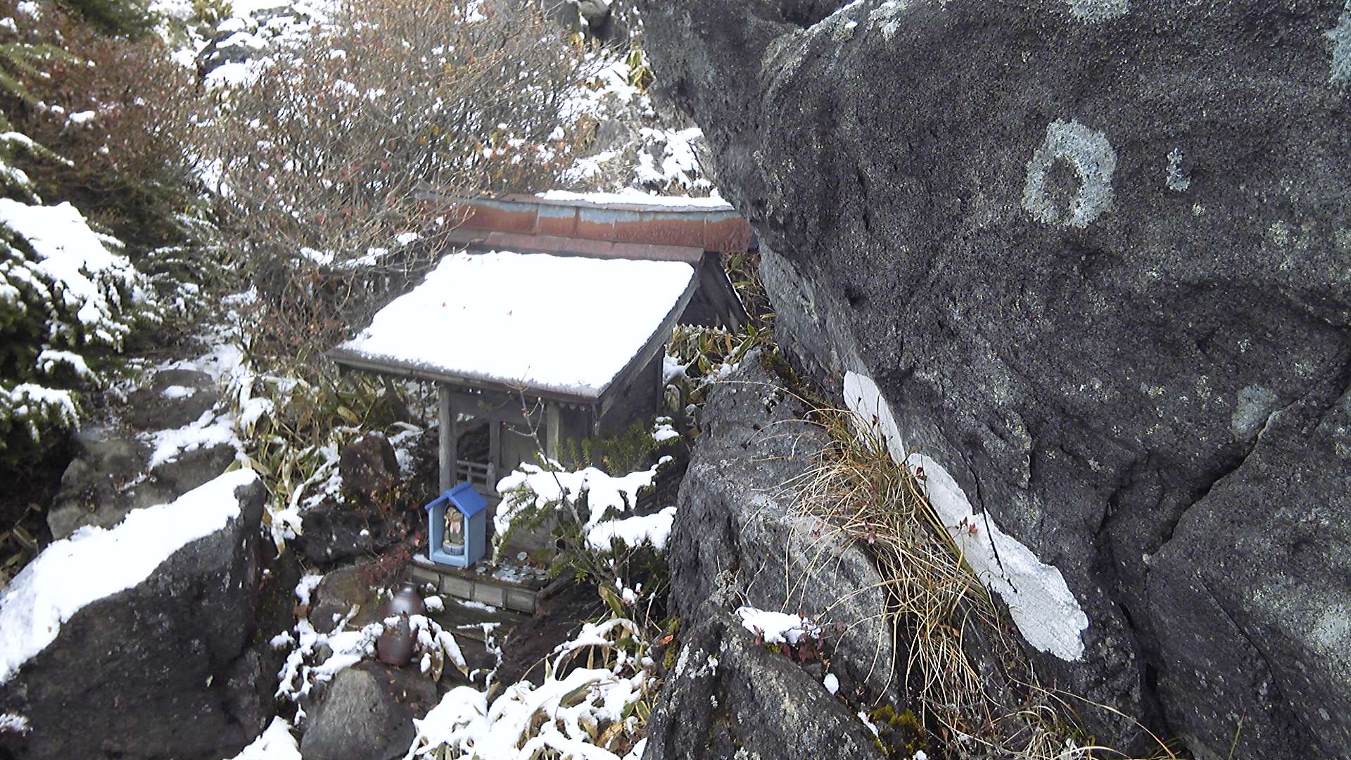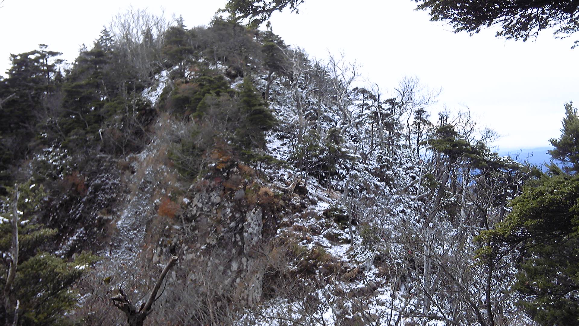 なるべく左足に体重をかけず、しかも滑らないように安定した足場を探すのは難儀である。そして、登山道にも岩の上にも雪が積もって、どこが夏道なのかよく分からない。