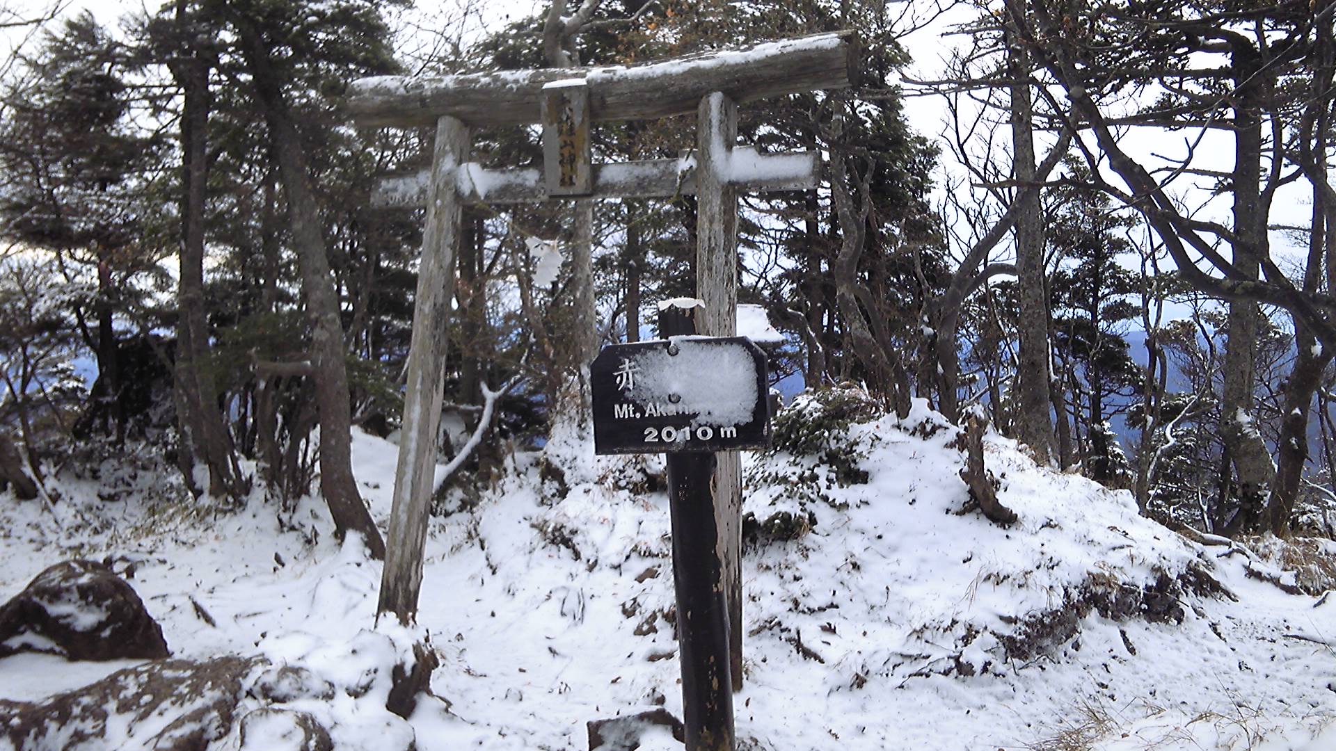 「赤薙山」の山名標にも神社の鳥居にも、強風で雪が吹きつけられて固まっている。この日は男体山の初冠雪だったと夕方の天気予報で言っていたが、標高2000m以上では雪だったようである。