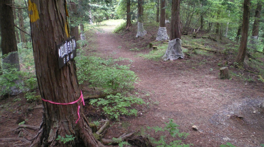 分かりにくいというよりも、林道から見えないようにわざわざ分かりにくくしているようだった。そこまで邪魔するなら、女峰山方向の案内表示や、丹勢山麓散策路の看板もなくせばいいのに、そこまでの覚悟はないようだ。