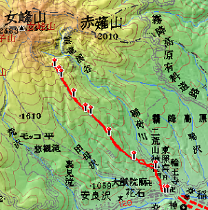当初の計画は、女峰山は無理でも一里ヶ曽根まで進出しようというものであった。それで、早朝の出発としたのである。一里ヶ曽根は赤薙山からさらに2時間、私の足だと麓から5時間みなければならない。