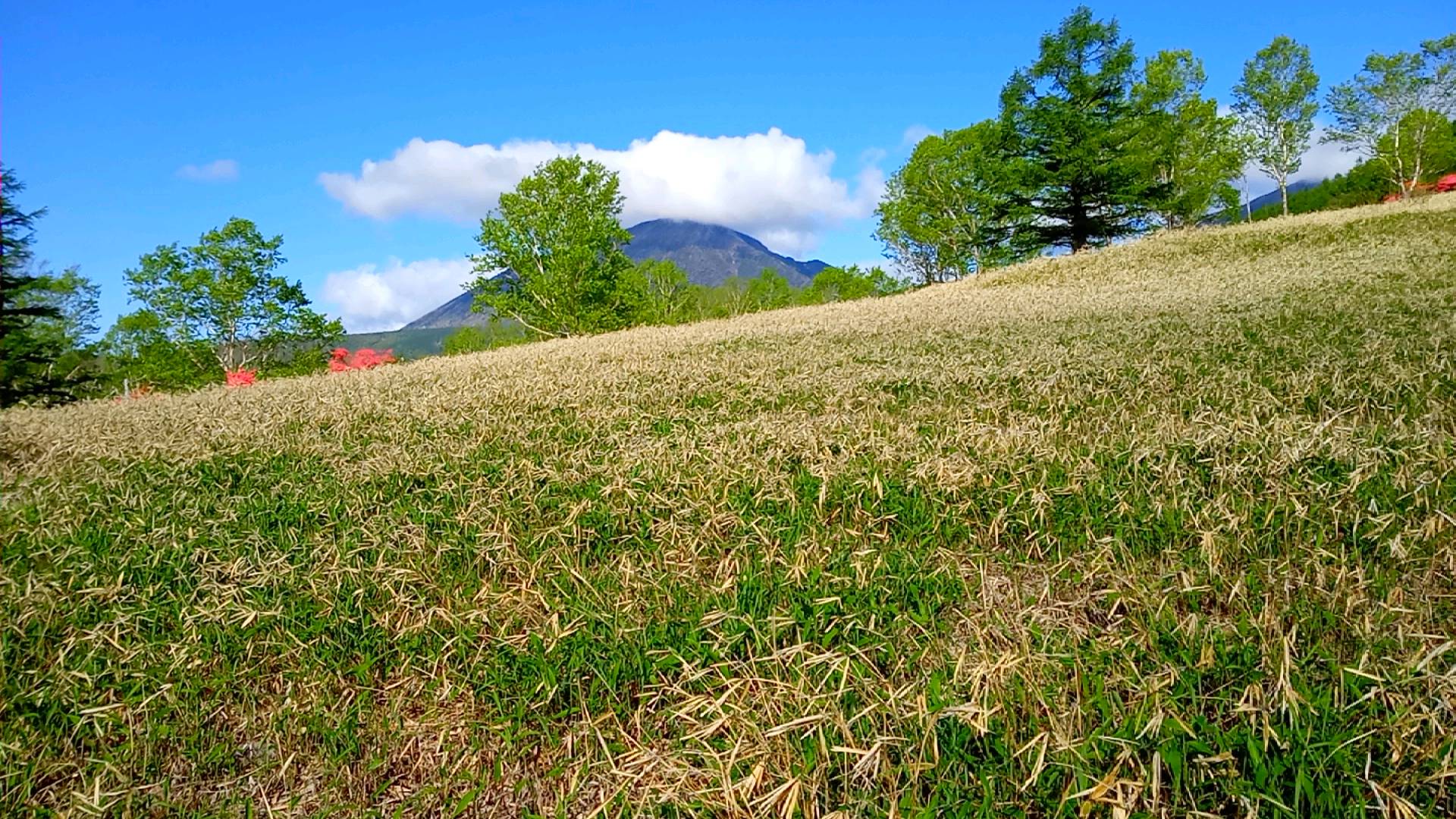 登山口の電子レンジのところに案内が書いてあって、距離的にはゲレンデ最上部が中間点のようだ。ただし、起伏はずいぶんゆるやかなので、標高としてはそれほど稼いでいない。
