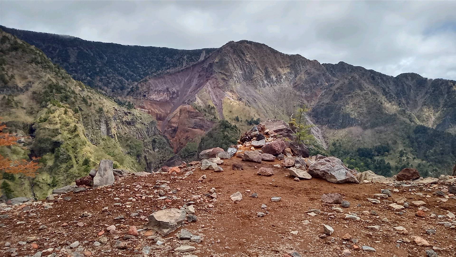 倒木を越えて稜線に出ると、その向こう側は崖である。稜線を左に進むと釈迦ヶ岳、右に進むと鶏頂山である。踏み跡はそこしかないし、目の前に山が見えているので迷うことはない。