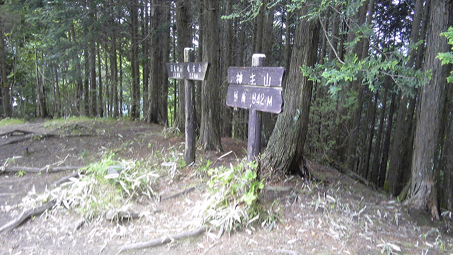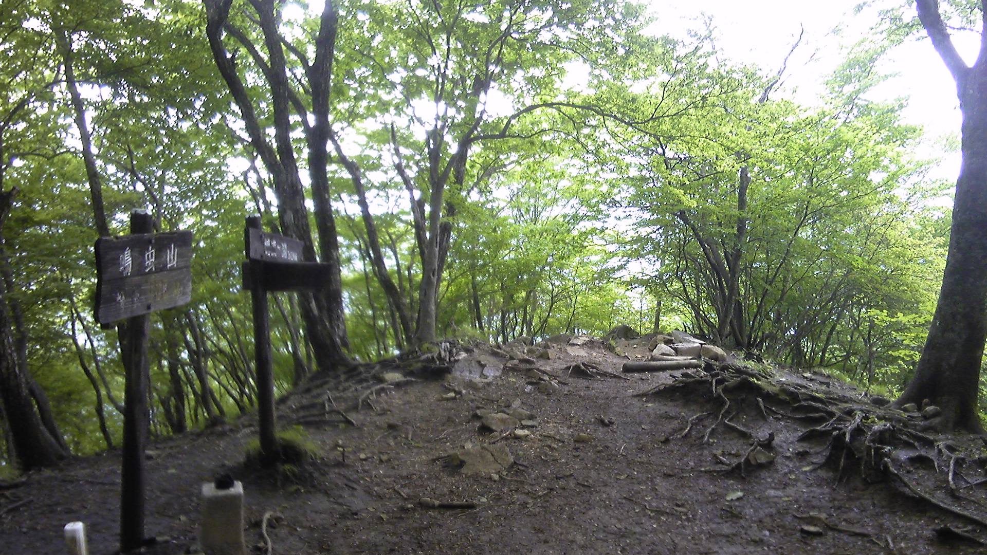 灌木をかき分けて急坂を登り、丹勢山頂上到着。眺めは開けないし、ベンチとかそういうものはない。国有林全般で人工物撤去が進んでいるせいだろうか。