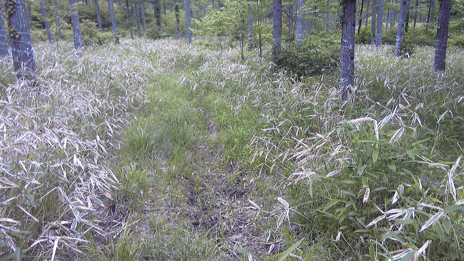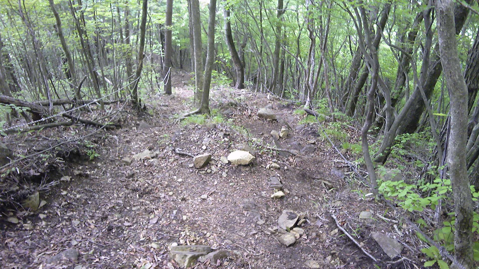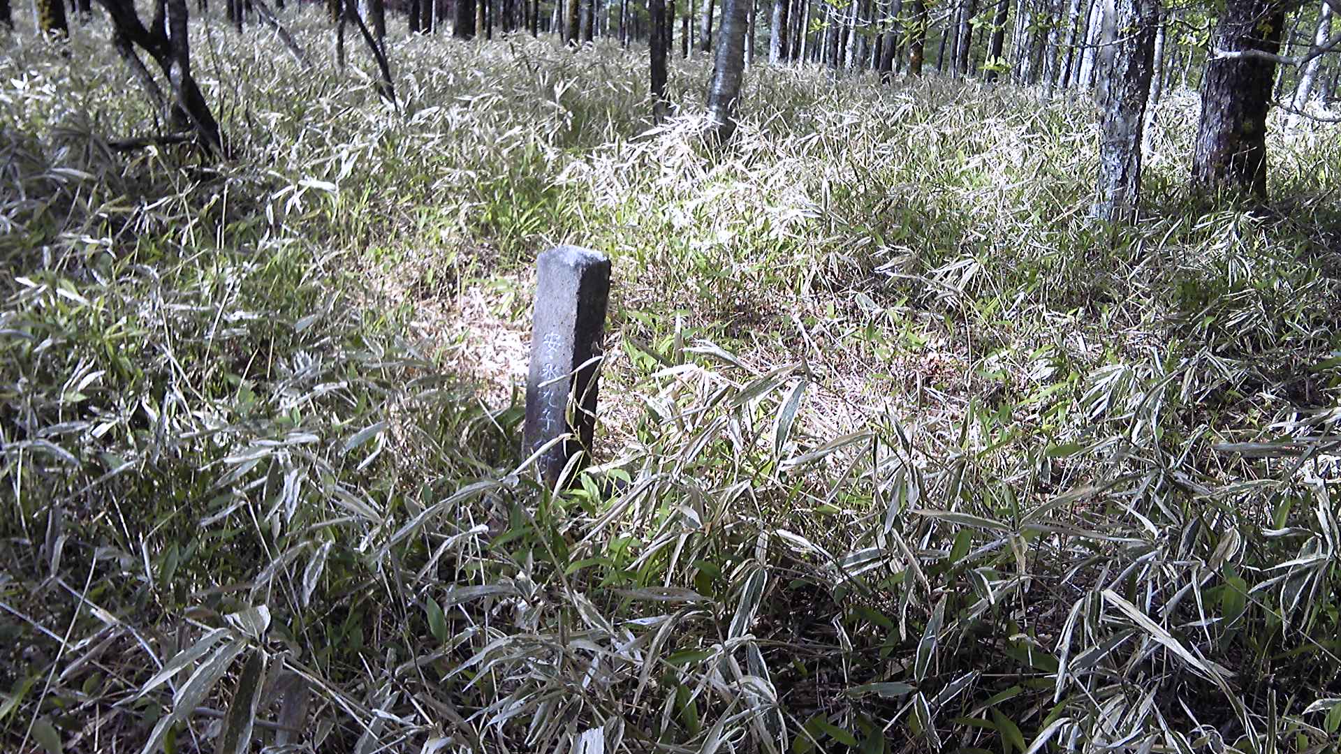 踏み跡らしき道筋に入るが、刈り払いはしていないし、人の通った気配がない。それより気になったのは、林道から登山道の分岐に柱とトラロープが倒された痕跡が残っていたことである。これは通行禁止ではないのか。