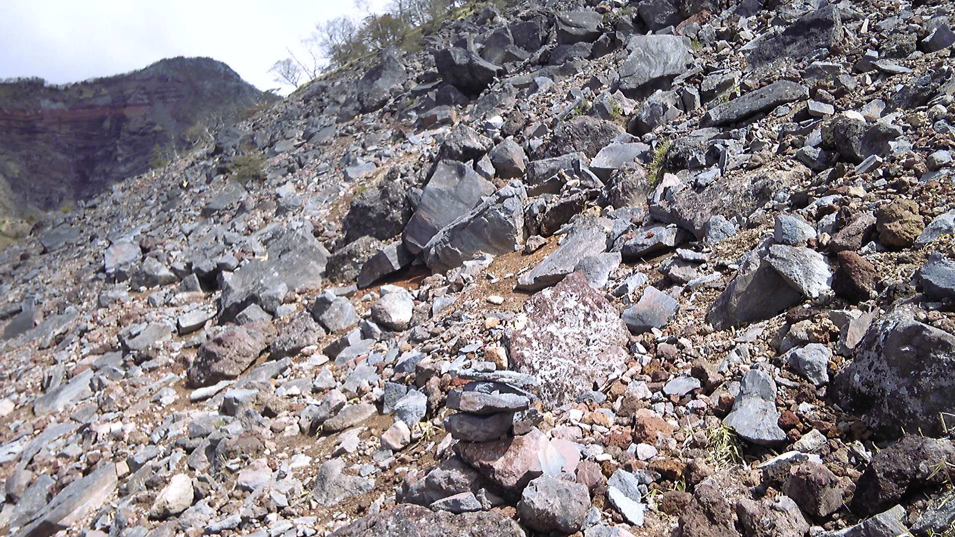 志津小屋方向は引き続き砂利道で、しかも大きな岩がごろごろしていてたいへん歩きにくい。車の轍のない中央部分を選んで歩くが、それでも陥没があるので足をまっすぐ置けない。はるか先まで進むと待避所のあるカーブで、方向転換して再び長い距離を歩く繰り返しである。