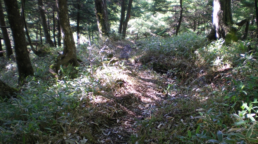 登山道はそれほどハードなものではないが、あまり刈り払いが行われていない。人通りも多くないようで、笹薮が腰辺りまで伸びているところもある。雨が降っていないからいいが、荒天なら林道経由が安心かもしれない。