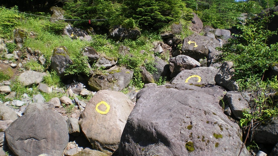 ガイドブックに「弁天池から右回りのコースをとる」と書いてあったが、空から見て右回りだから向かって左のルートである。赤テープはあるけれども案内表示はない。谷沿いに進むルートで徐々に険しくなる。