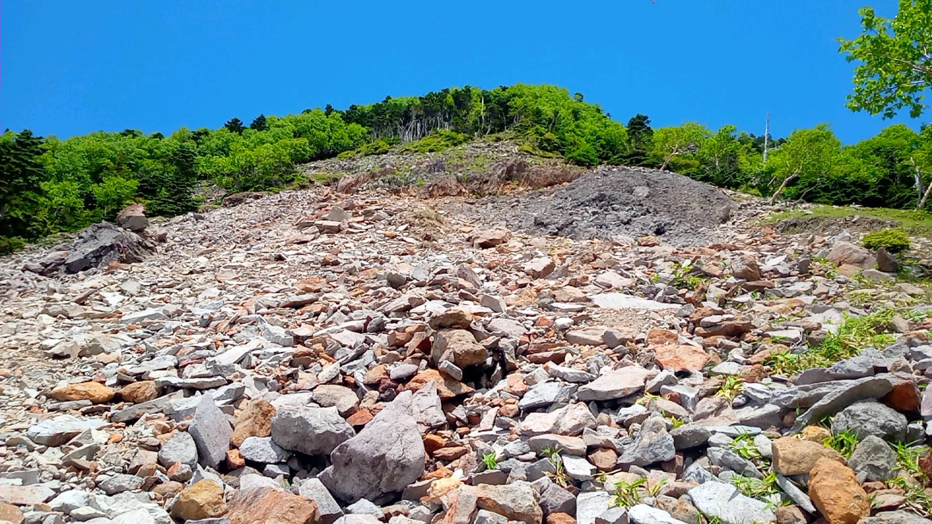 雨量測定所から10分ほどで、左が開けた広場になった。目の前には男体山。たいへんいい景色だが、国有林の常で案内看板もなければベンチもない。しかし、このあたりに山頂への取り付きがあるはずだ。