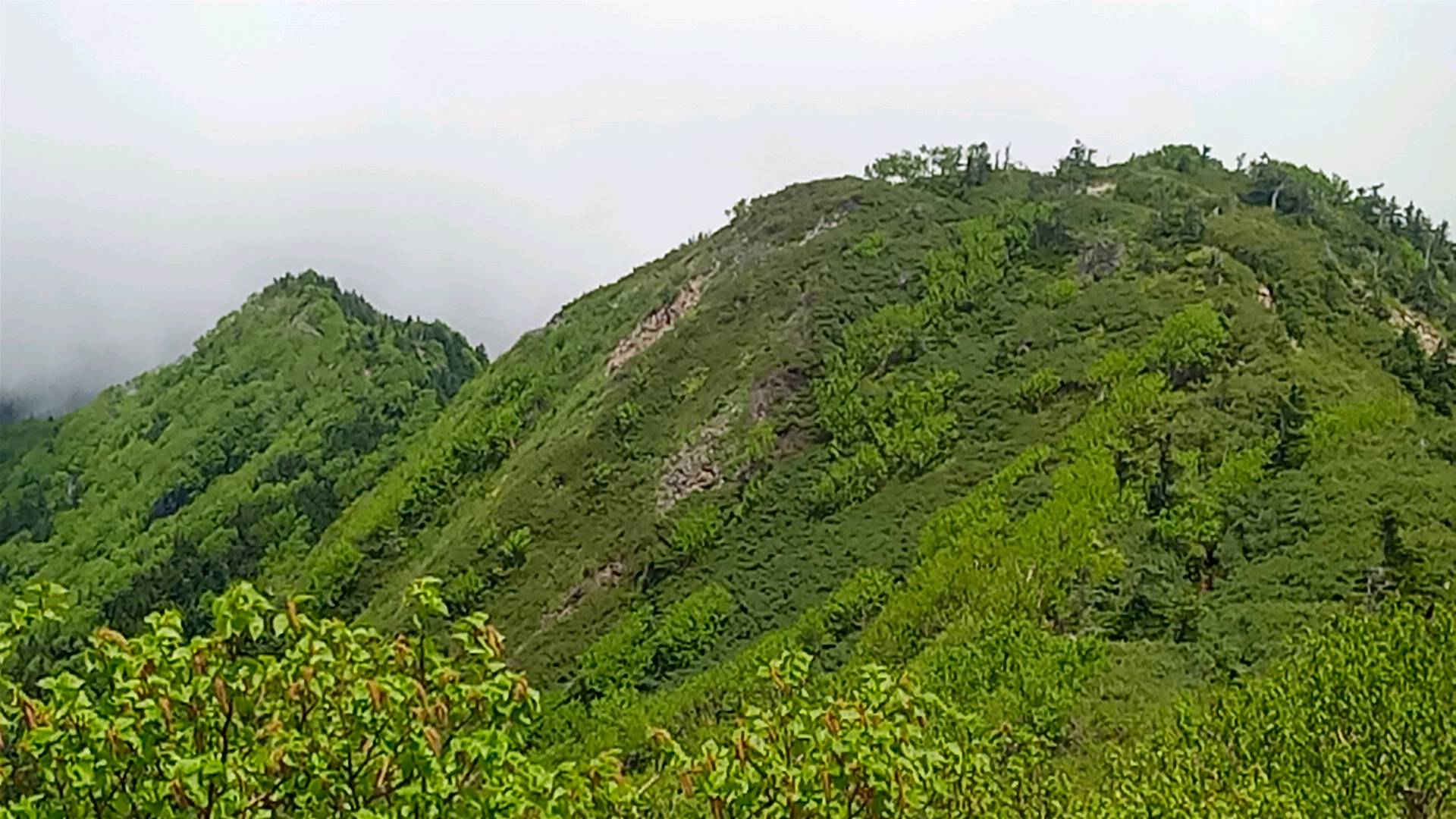 女峰山がこうやって隠れていくのは以前も何度か見たことがある。赤薙山の時は、昼過ぎから土砂降りとなった。男体山では夕方ホテルに着いたら降り出した。予報では「夜になると雨のところがあるでしょう」とお気楽なものだったが、下山までもつだろうか。