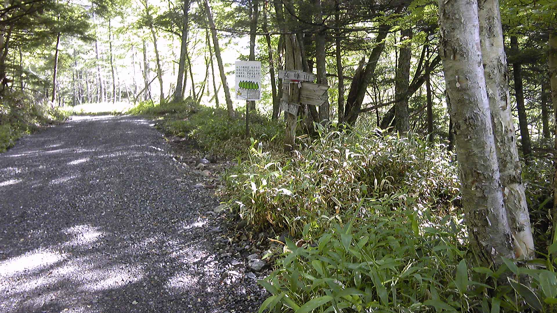 キノミ平分岐から先は路面が悪くなっただけでなく、ふたたび林間になって展望がきかなくなる。大きなスイッチバックでかなりの距離歩かされるので、どこまで登ったらいいのか分かりにくい。それでも、30分ほど歩くと「林道交通安全」の幟がある分岐点に達した。