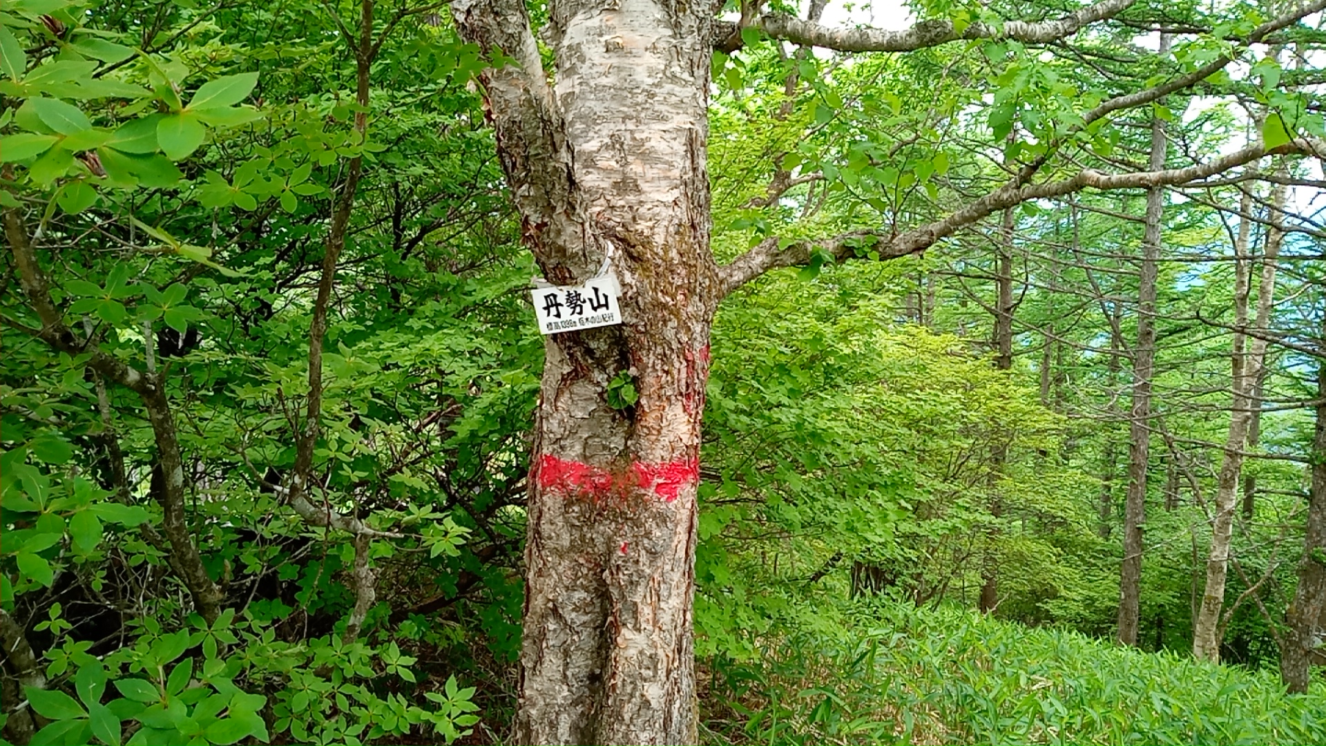 右手の木の低い場所に「丹勢山 1346m」の消えかけた山名標があった。奥に進むと幹にペンキマークのある木があって、そこにも「丹勢山 栃木の山紀行」の山名標があった。こちらはまだ書体ははっきりしている。