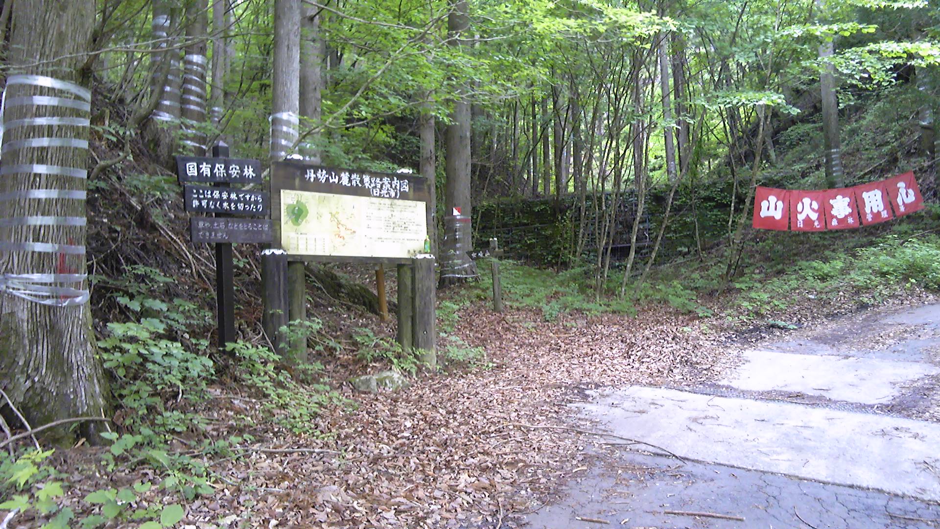 豪快に落ちる裏見の滝を後にして、いったん駐車場に戻る。丹勢山へは女峰山の案内のある方向、「山火事用心」の横を入る。おなじみの日光標識がある。しかも、最近付け替えられた新しいものだ。