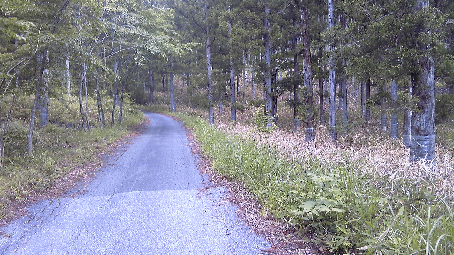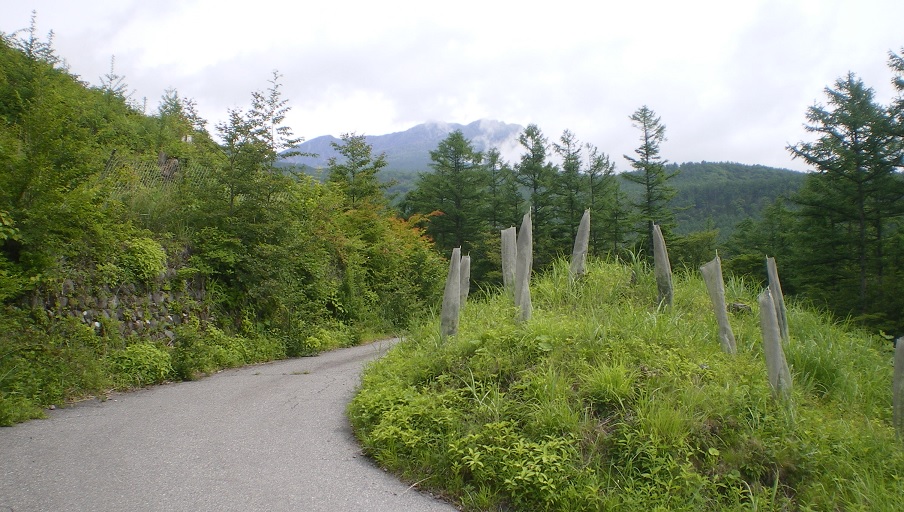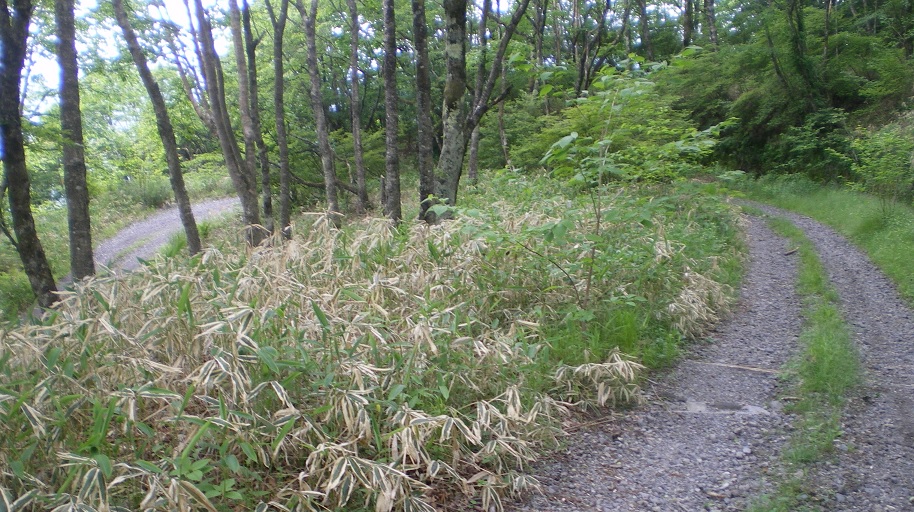林道歩きはたいへん快適である。このあたりは路面がいいので、右足と左足を交互に出していれば前に進む。林間の登山道では湿気がきつくてむっとしたが、林道はさわやかに風が抜けて汗が引いた。
