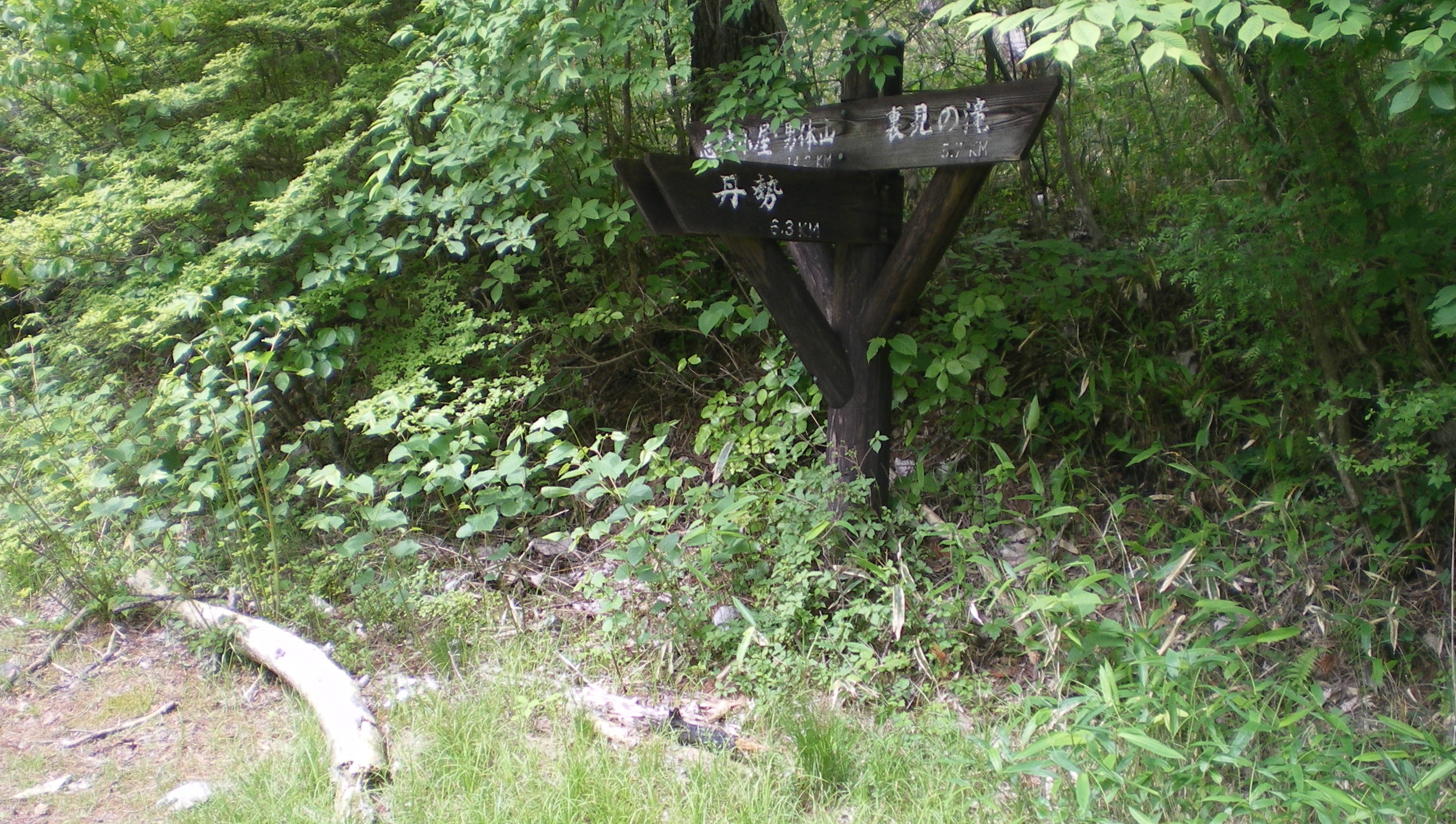 ガイドブックで裏見滝分岐と呼ばれる林道分岐。志津小屋方面に進むのが正解だが、丹勢と示してある方に進んでしまう。