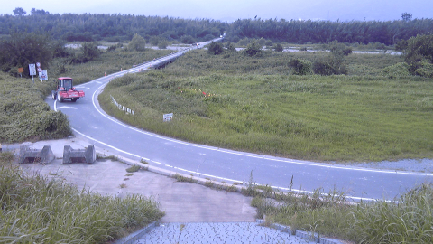 北側の大野島潜水橋から20分歩くとようやく道が左カーブとなり、南側の橋である川島潜水橋が見えてきた。大野島潜水橋では川の水はそれほど見えなかったが(下の写真)、川島潜水橋の下は結構な川の流れがある。こちらの潜水橋も、路肩の脇には何もない。ちょうど橋の中ほどで対抗車が来る。慎重に路肩に上がってやり過ごす。