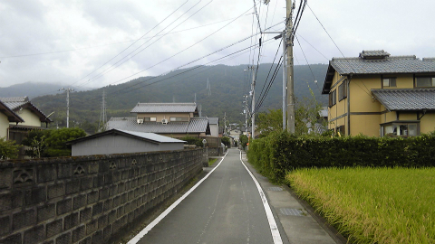 秋月城跡を過ぎてしばらく歩くと、山の方向、北に向きを変えるよう道案内がある。これまでの片側一車線の道路から、車一台ようやく通れるくらいの狭い路地で、ここから十番切幡寺まで長い登り坂となる。