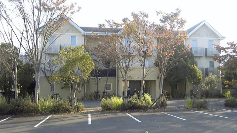 国道に沿ってローソンまで歩き、そこから山に向かって南に進む。前回、雨の中を歩いた道である。進行方向に見える鉄筋4階建ての建物は、公営住宅のようである。階段のところに常夜灯が点けられていてとても明るい。