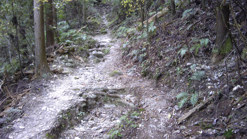 柳水庵を下りてすぐの林道は自動車も走っていて、道路の上には「吉野川市」と表示がある。へんろ道は林道をまたいで南側に伸びていて、かなりの急坂である。しかし次第に傾斜が楽になり、ほとんど遊歩道のような道になった。