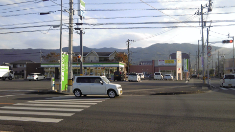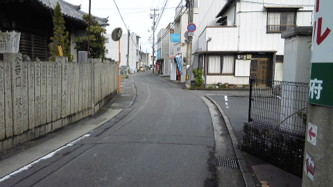 大御和神社の前をまっすぐ進むと、やがて交通量の多い通りに出る。近くにスーパーマーケットも見えるので、駅前通りなのかもしれない。このあたりで、井戸寺に向かう道案内を見つけた。この大通りを渡って、反対側の細い通りへと行き先を指示している。しかし、指示のとおりに通りの向こう側に渡ると、案内もシールもなくなってしまった。