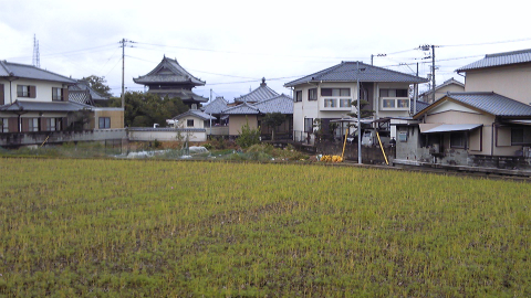 そんなこんなで神経を使っていたら結構長く感じた。トラックの交差点からしばらく進むと、畑と住宅地の間から、奈良市内でよく見る雰囲気の建築物が見えてきた。あれが国分寺に違いない。