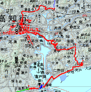[行 程](→ 高知リッチモンドホテル→)中島バス停 8:45 →(4.0km)9:35 塚地休憩所 9:40 →(0.8km)10:00 塚地峠 10:10 →(3.3km)11:00 宇佐町ファミマ 11:05 →(3.5km)11:50 青龍寺 12:15 →