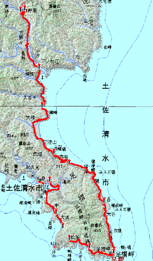 [行 程]真念庵 14:30→(5.2km) 15:55 下ノ加江(泊) 5:20→(7.0km) 7:00 大岐海岸 7:00→(3.5km) 7:45 以布利じんべえ広場 8:00→(13.5km)11:05 三十八番金剛福寺 11:30→