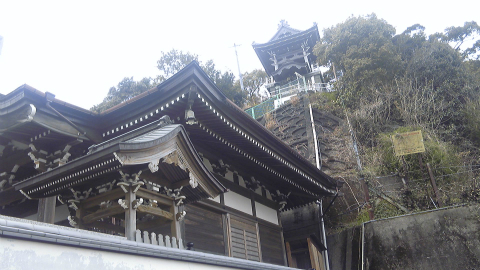 山門から見上げる大善寺鐘楼。鐘楼の奥に本堂がある。自然の地形を利用した津波タワーである。