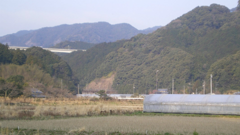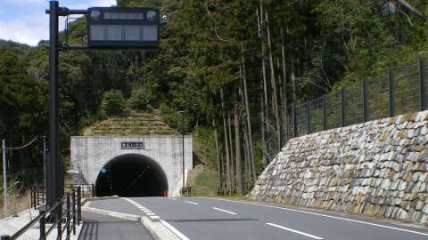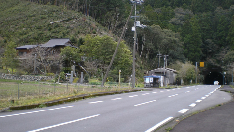 高速の入口を過ぎたあたりから道は徐々に登り坂になり、次にトンネルが出てくる。毎度おなじみ、四国の峠道である。1つ目は角谷トンネル、次が久保宇津トンネル。向こう側が見えるくらいの200~300mのトンネルだが、歩道がないので緊張する。「歩行者に注意」「学童は左側通行」と大きな看板があるところをみると、通学路にもなっているらしい。